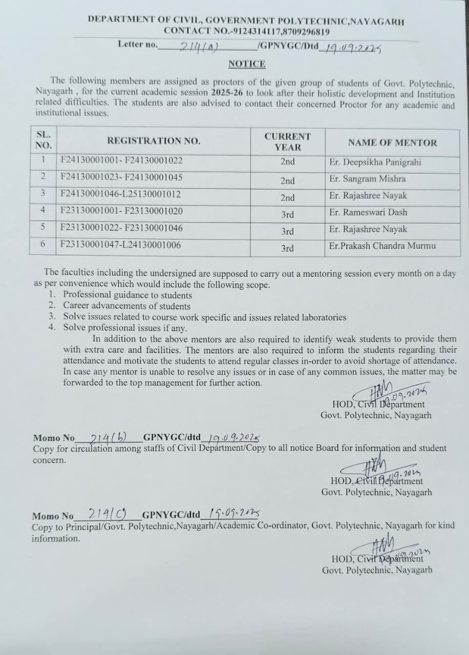 The Department of Civil Engineering has been in existence since 2014 and is producing high quality technical manpower needed by industry, R&D organizations, and academic institutions. The yearly intake of the department is 60 for regular three-year Diploma course to meet the growing requirements for emerging needs of Civil Engineering field. The departmental activities embrace Planning, Design, Construction and Management. The Department has well qualified faculty members and excellent laboratory facilities . The Diploma program imparts students to master over the field of Civil Engineering besides knowledge of recent trends and development to shine as a successful Civil Engineer. Students gain experience from field visit to nearby construction sites, dams and irrigation structures etc.